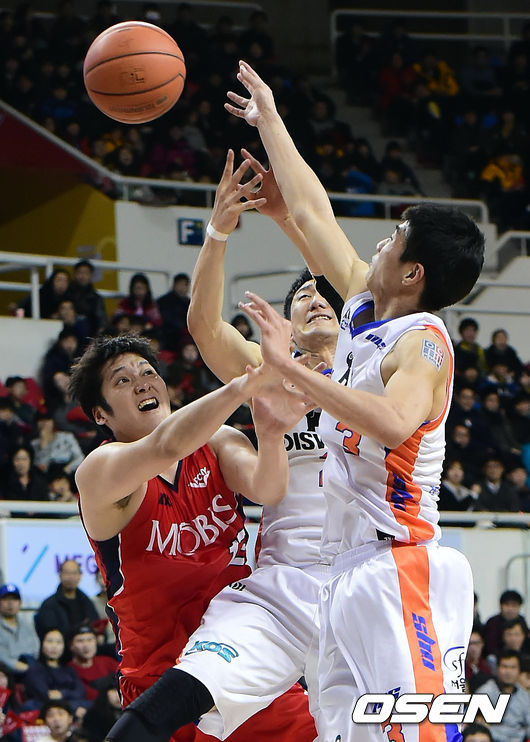 2쿼터 모비스 함지훈과 전자랜드 정영삼, 김지완이 리바운드 다툼을 벌이고 있다.