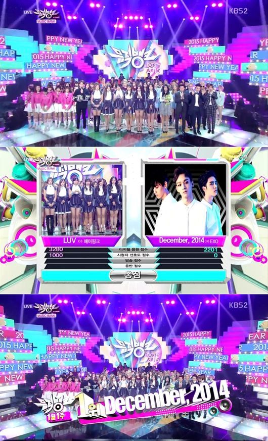 엑소는 2일 오후 방송된 KBS 2TV 가요프로그램 ‘뮤직뱅크’에서 ‘디셈버 2014(December 2014)’로새해 첫 1위 트로피를 품에 안았다.