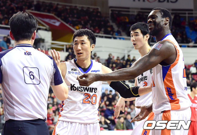2쿼터 전자랜드 레더가 테크니컬 파울에 대해 어필하고 있다.