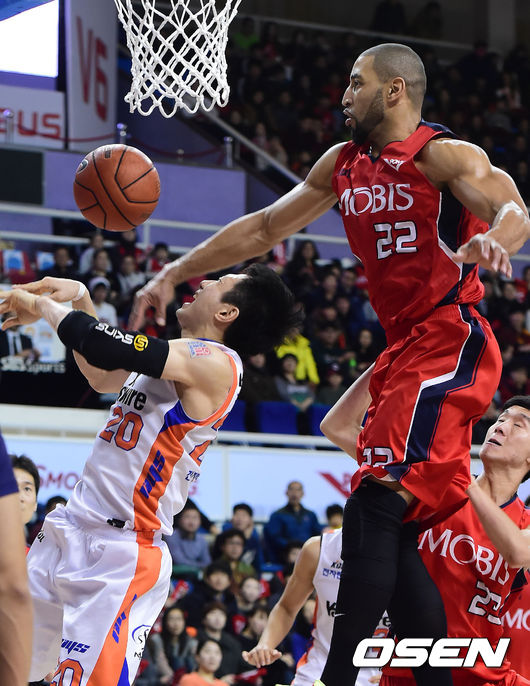 3쿼터 모비스 클라크가 전자랜드 정영삼의 레이업때 블로킹을 시도하고 있다.