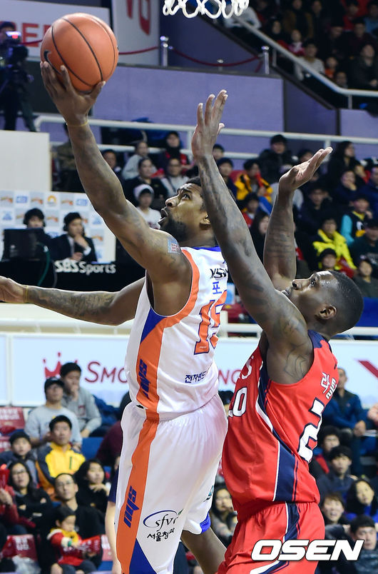 4쿼터 전자랜드 포웰이 골밑슛을 시도하고 있다.