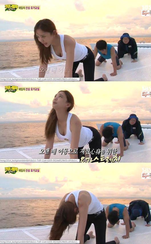 생각보다 고기가 잡히지 않자, 네 사람은 선상에서 운동을 시작했고, 태임은 병만과 류담에게 요가 강습을 했다. 그 과정에서 그녀의 S라인 자연스레 드러나며 시청자들의 시선을 강탈했다.
