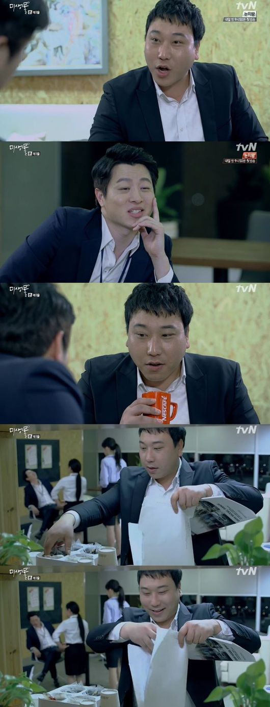 개그맨 곽한구가 '미생물'에서 자동차 딜러로 등장, 마시는 '차'를 훔쳐갔다.
