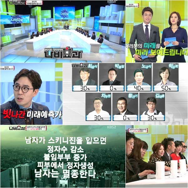 ‘나비효과’는 베일에 가려진 예언자의 황당하고 특이한 예언을 보며 7인의 미래평가단이 과연 이 미래가 일어날 것인가에 대한 토론을 펼치는 프로그램. 첫 방송에는 ‘남편이 집안일을 하면 집값이 폭락한다’, ‘샤워를 오래 하면 벌레버거를 먹게 된다’, ‘남자가 스키니진을 입으면 남자는 종말한다’는 예언으로 구성됐다.