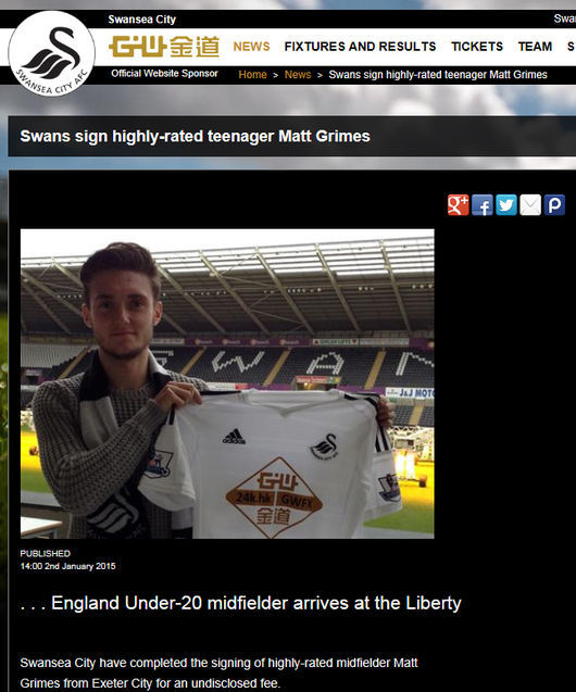 스완지 시티가 겨울 이적시장에서 엑스터 시티의 미드필더 맷 그라임스(20)를 영입했다.