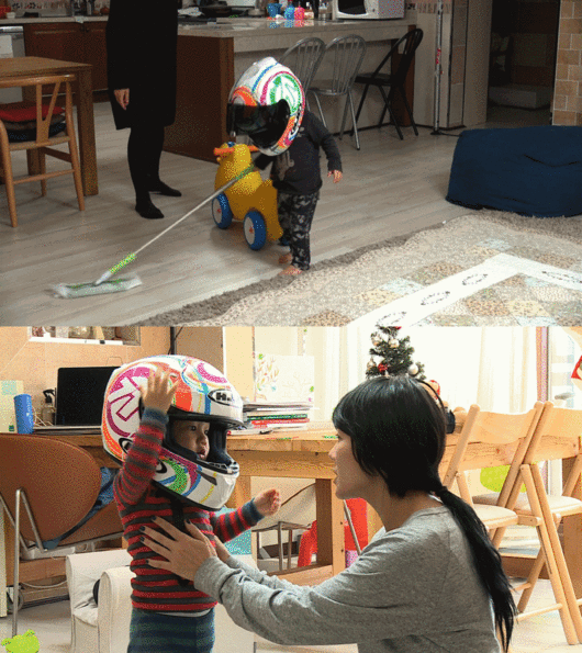 커다란 헬멧을 쓴 채로 장난감 오토바이도 타고, 동화책도 읽고, 일상생활을 하는 엉뚱하면서도 황당한 모습은 모두를 폭소케 했다. 그런데 문제는 태오가 헬멧만 썼다하면 좀처럼 벗을 생각을 안 한다는 것. 이에 리키김은 ‘헬멧 벗기기 대작전’을 세웠다.