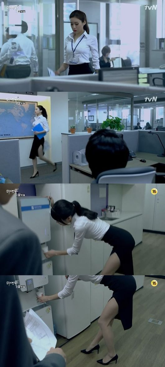 이에 장도연 또한 극 중 하얀 블라우스와 과감한 트임의 펜슬 스커트를 입고 우월한 비율과 볼륨감 넘치는 몸매로 등장해 장그래 역의 장수원을 비롯해 김동식 대리 역의 이진호의 시선을 단숨에 사로잡았다.