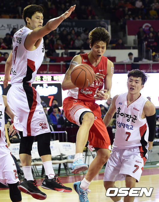 3일 오후 서울 잠실학생체육관에서 열린 '2014-2015 KCC 프로농구' 서울 SK와 안양 KGC의 경기, 1쿼터 SK 김선형이 슛 시도중 공을 놓치고 있다.
