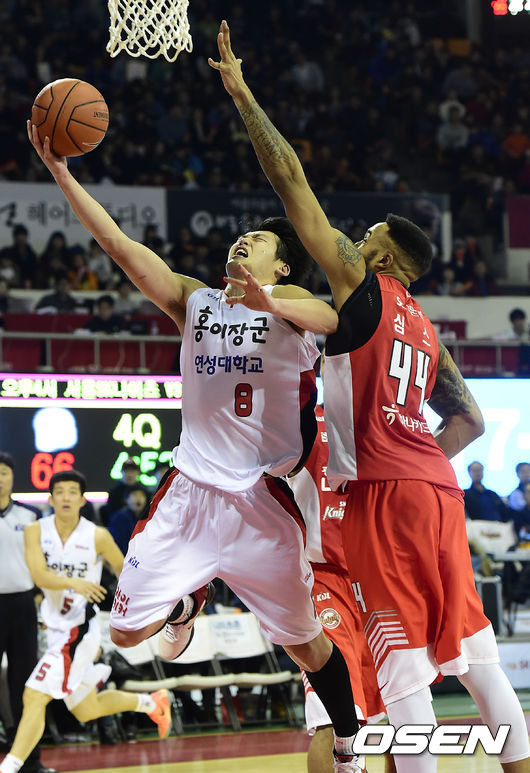 3일 오후 서울 잠실학생체육관에서 열린 '2014-2015 KCC 프로농구' 서울 SK와 안양 KGC의 경기, 4쿼터 안양 최현민이 SK 헤인즈의 수비를 피해 레이업슛을 시도하고 있다.