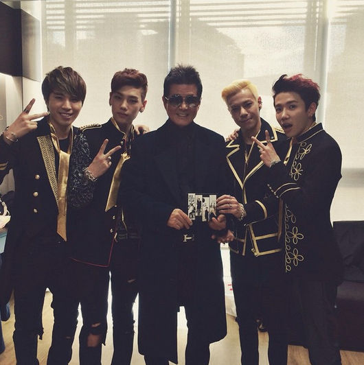 공개된 사진 속에는 하이포의 앨범을 들고 있는 태진아의 양 옆에 서서 포즈를 취하고 있는 하이포 멤버들의 모습이 담겨있다. 특히 이들은 엄격한 선후배 관계가 아닌 아버지와 아들들 같은 다정한 모습으로 눈길을 끈다.