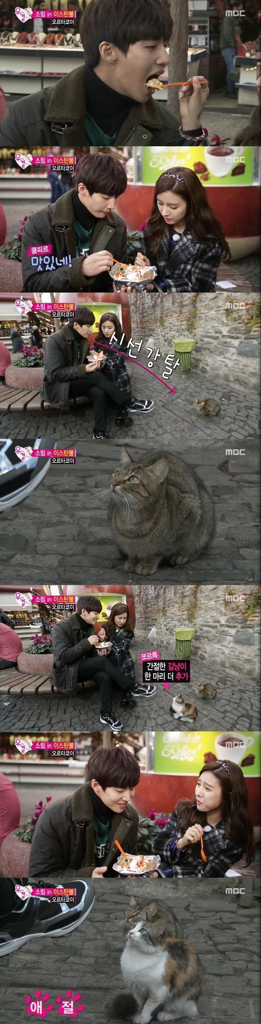 송재림과 김소은은 3일 오후 방송된 MBC 예능프로그램 '우리 결혼했어요 시즌4'(이하 '우결')에서 터키의 길거리 음식인 쿰피르를 먹다 자신들에게 다가온 두 마리의 고양이에 시선을 빼앗겼다.