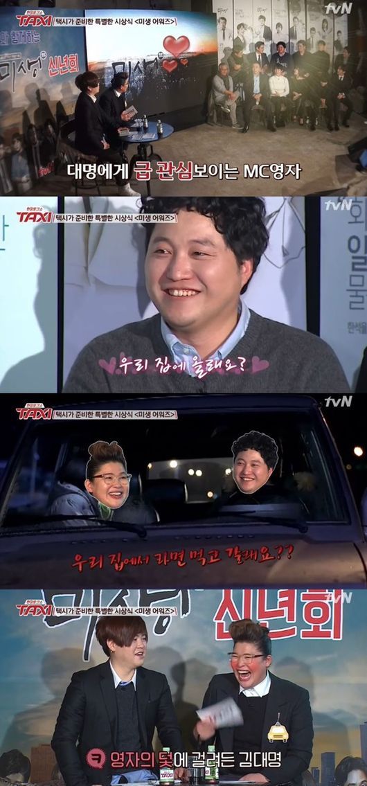 3일 오후 방송된 tvN '현장토크쇼 택시'(이하 '택시')는 드라마 '미생' 특집으로 출연배우 12인이 함께 하는 토크쇼 '미생 신년회 2탄'이 꾸며졌다. 이날 '베스트 케미커플' 시상식을 진행하던 중, 이영자는 김대명-임시완의 커플 후보를 전하면서 김대명에게 호기심을 내비쳤다.