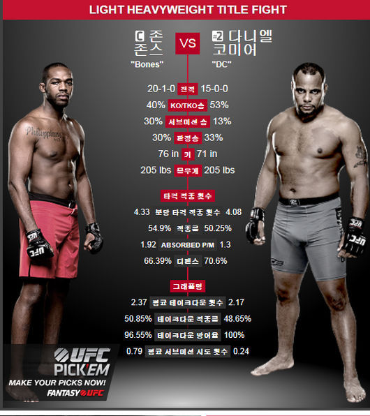 존 존스는 4일(이하 한국시간) 미국 라스베가스에 위치한 MGM 그랜드 가든 아레나서 열린 UFC 182 라이트헤비급 챔피언 타이틀 매치서 다니엘 코미어(36)를 상대로 승리를 거뒀다. 존 존스는 5라운드 내에 승부를 보지 못했지만 심판 전원일치 판정승으로 챔피언 벨트를 지킬 수 있었다.