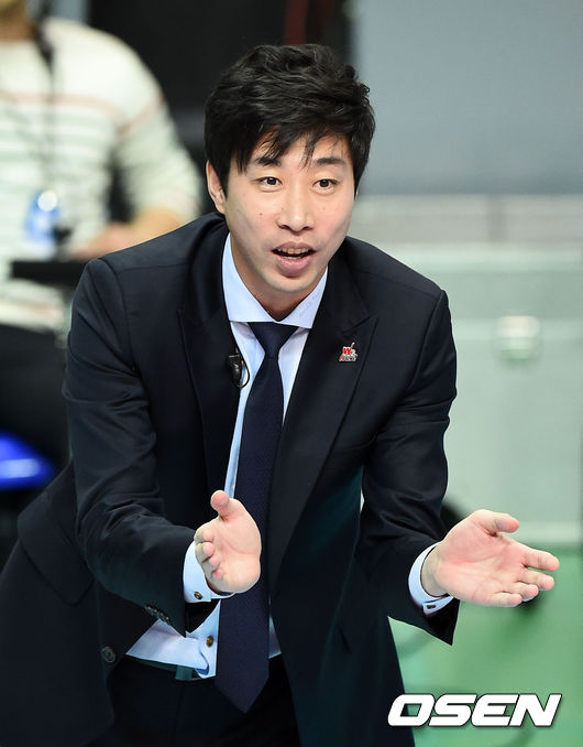 2세트 OK저축은행 김세진 감독이 작전을 지시하고 있다.
