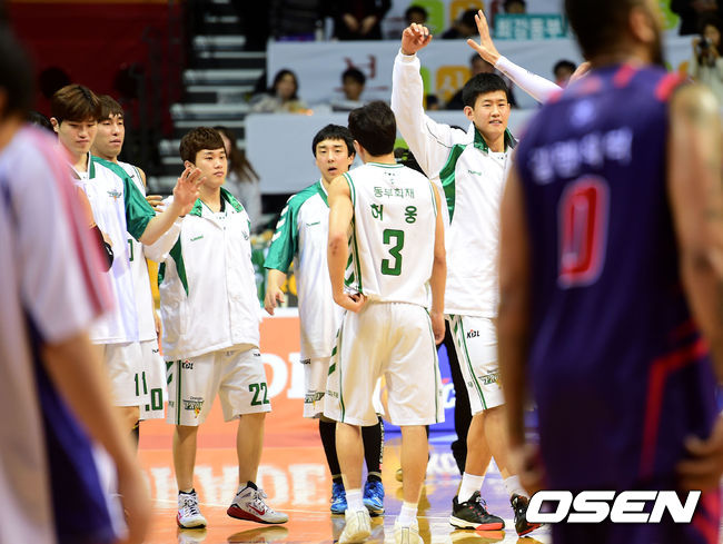 경기 종료, 승리한 동부 선수들이 기쁨의 인사를 나누고 있다./ouxou@osen.co.kr