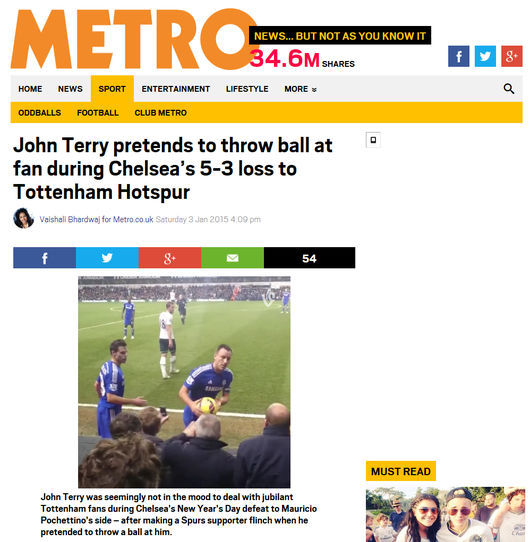 4일 영국 매체 '메트로'의 보도에 따르면 테리는 1-4로 지고 있는 상황에서 터치라인 밖으로 나간 공을 가지러 관중석 근처로 향했고, 이를 지켜보던 중년의 남성이 손가락으로 테리를 가리키며 점수 차에 대해 이야기하며 자극했다.
