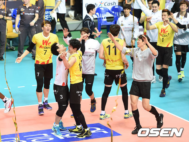 경기 종료 후 OK저축은행 선수들이 승리의 기쁨을 나누고 있다. /sunday@osen.co.kr