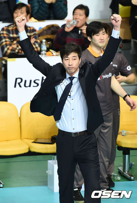 경기 종료 후 OK저축은행 김세진 감독이 승리에 환호하고 있다. /sunday@osen.co.kr