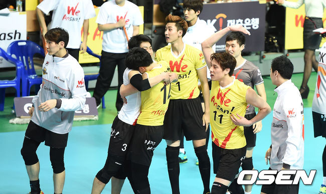 경기 종료 후 OK저축은행 선수들이 승리의 기쁨을 나누고 있다. /sunday@osen.co.kr