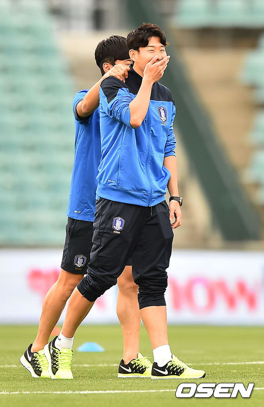 4일 오후 호주 시드니 퍼텍경기장서 열린 사우디아라비아와 평가전에서 경기 전 몸을 풀던 손흥민이 김진수의 말에 환하게 웃고 있다.