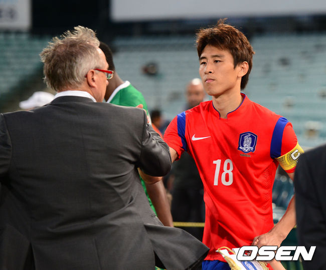 4일 오후 호주 시드니 퍼텍경기장서 열린 사우디아라비아와 평가전에서 구자철과 슈틸리케 감독이 하이파이브를 하고 있다.