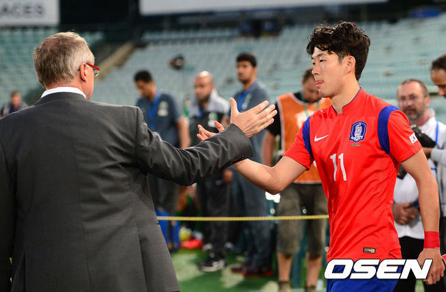 4일 오후 호주 시드니 퍼텍경기장서 열린 사우디아라비아와 평가전에서 손흥민과 슈틸리케 감독이 하이파이브를 하고 있다.