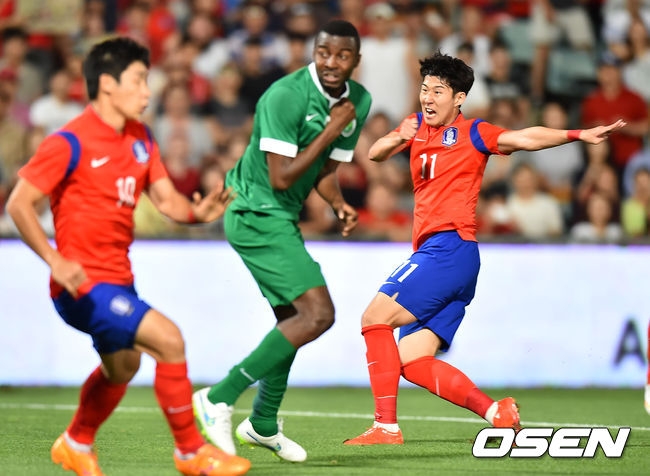 4일 오후 호주 시드니 퍼텍경기장서 열린 사우디아라비아와 평가전에서 전반 한국 손흥민이 슈팅을 하고 있다.