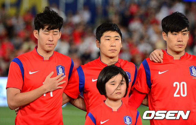 4일 오후 호주 시드니 퍼텍경기장서 열린 사우디아라비아와 평가전에서 손흥민, 이근호, 김주영이 애국가를 부르고 있다.