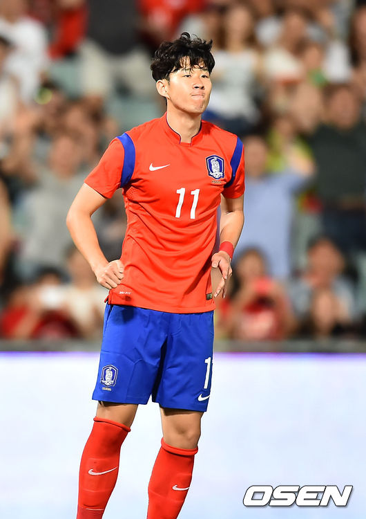 4일 오후 호주 시드니 퍼텍경기장서 열린 사우디아라비아와 평가전에서 전반 한국 손흥민이 강력한 슛이 사우디의 골대를 맞고 빗나가자 아쉬운 표정을 짓고 있다.