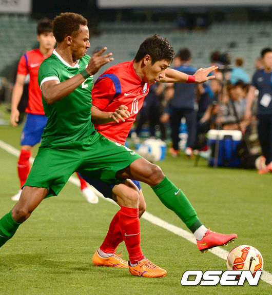 4일 오후 호주 시드니 퍼텍경기장서 열린 사우디아라비아와 평가전에서 전반 한국 이근호가 사우디아라비아 수비와 볼다툼을 하고 있다.