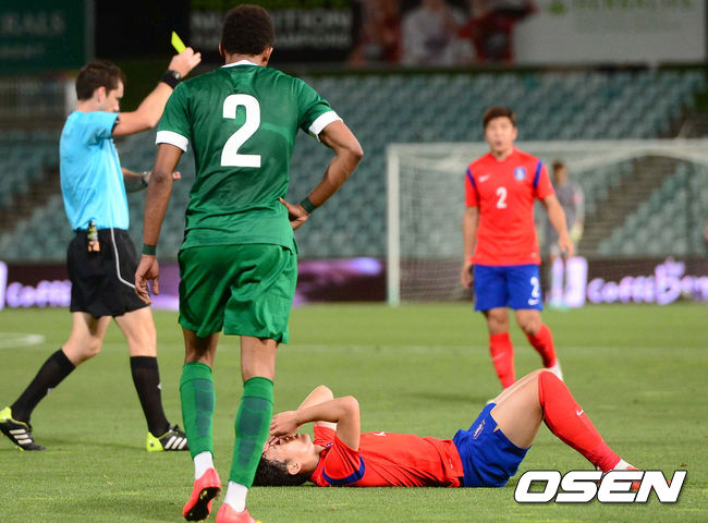 4일 오후 호주 시드니 퍼텍경기장서 열린 사우디아라비아와 평가전에서 전반 한국 손흥민이 반칙을 당하고 그라운드에 누워 고통스러워하고 있다.
