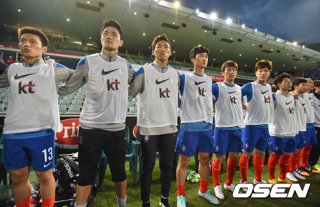 4일 오후 호주 시드니 퍼텍경기장서 열린 사우디아라비아와 평가전에서 한국 벤치 멤버들이 애국가를 부르고 있다.