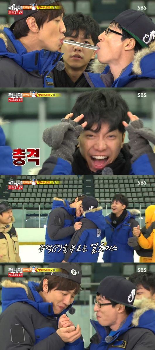 유재석와 이광수가 승리를 위해 입술을 밀착하는 얼음 키스를 했다.