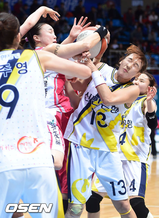 4일 오후 인천 도원체육관서 열린 'KB국민은행 2014-2015 여자프로농구' 인천 신한은행과 부천 하나외환의 경기, 1쿼터 하나외환 김정은과 신한은행 김단비가 리바운드를 다투고 있다.