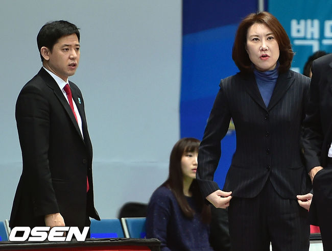 4일 오후 인천 도원체육관서 열린 'KB국민은행 2014-2015 여자프로농구' 인천 신한은행과 부천 하나외환의 경기, 2쿼터 하나외환이 역전 당하자 신기성 코치와 정선민 코치가 어두운 표정을 짓고 있다.