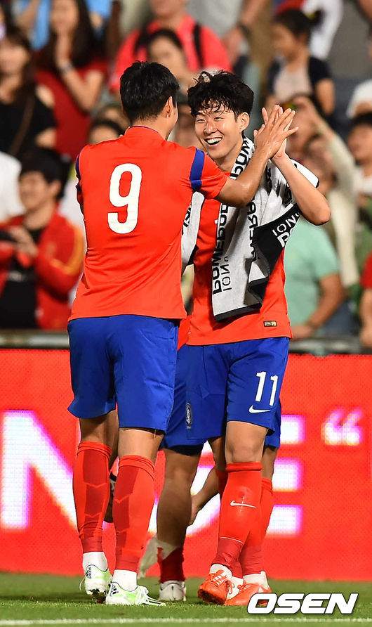경기 종료 후 한국 이정협과 손흥민이 환호하고 있다. / rumi@osne.co.kr