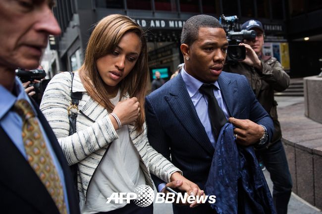 NFL의 무기한 출장정치 처분에 반발해 피해자인 아내와 함께 항소법원에 출석하던 당시의 레이 라이스(우측). 메이저리그는 라이스 사건 이후 가정폭력 규제안 마련에 들어갔다. ⓒAFPBBNews = News1(무단전재 및 재배포 금지)