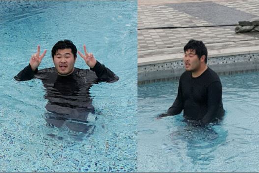 사진 속에서 김기방은 영하를 넘나드는 추운 겨울날 몸을 사리지 않는 수영장 물개 연기를 보여주고 있다. 특히 물에 젖어 몸에 밀착돼 적나라하게 보이는 김기방의 몸매가 인상적이다.