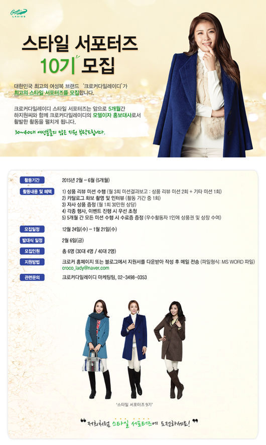 배성호 크로커다일레이디 본부장은 “여자의 행복을 디자인하는 크로커다일레이디가 주부들의 꿈을 응원하기 위해 ‘스타일 서포터즈’를 벌써 10기째 모집하게 됐다”며 “’스타일 서포터즈’를 통해 대한민국 주부들이 새로운 자아실현의 계기를 마련하길 바란다”고 밝혔다.