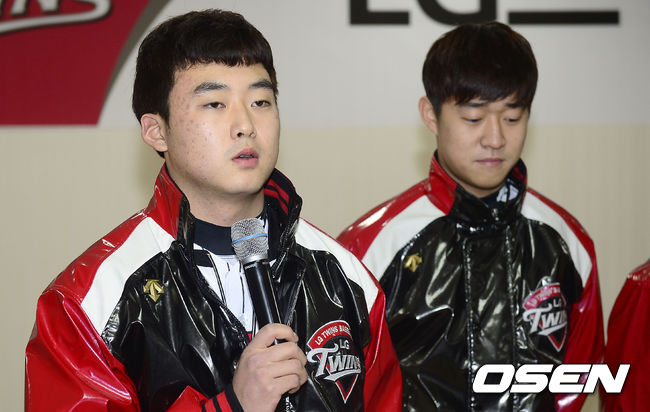 5일 오전 서울 잠실야구장에서 열린 프로야구구단 LG 트윈스의 2015년 시무식 행사에서 신인대표 김재성이 인삿말을 전하고 있다.