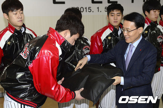 5일 오전 서울 잠실야구장에서 열린 프로야구구단 LG 트윈스의 2015년 시무식 행사에서 남상건 사장이 신인대표 김재성에게 선물을 증정하고 있다.