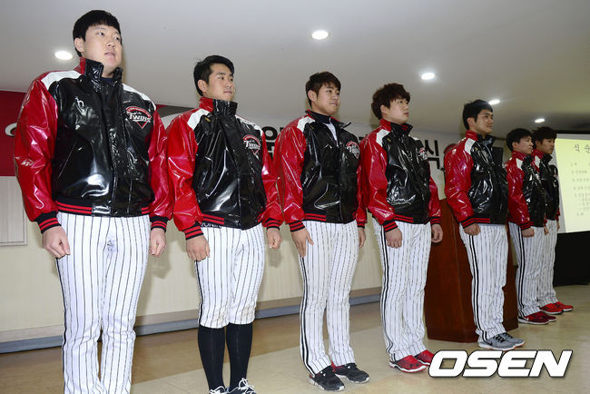 5일 오전 서울 잠실야구장에서 열린 프로야구구단 LG 트윈스의 2015년 시무식 행사에서 군제대후 복귀한 선수들이 인사 하고 있다.