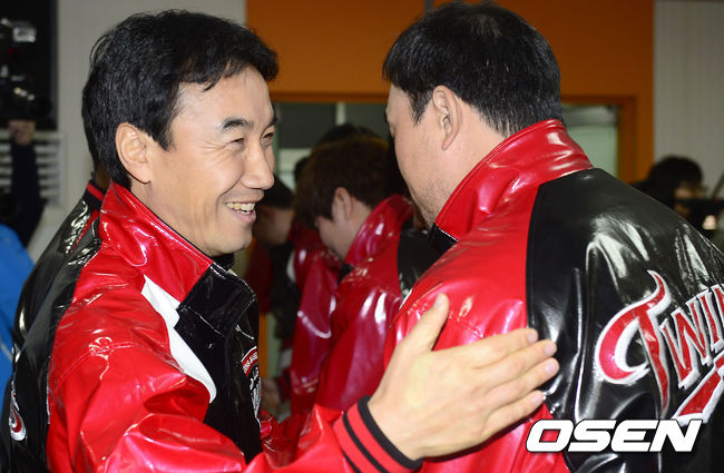 5일 오전 서울 잠실야구장에서 열린 프로야구구단 LG 트윈스의 2015년 시무식 행사에서 김동수 2군 감독이 선수들과 인사를 나누고 있다.