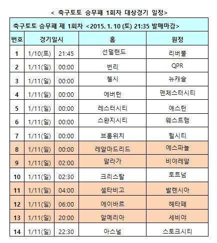 국민체육진흥공단(www.kspo.or.kr)이 발행하는 체육진흥투표권 수탁사업자인 스포츠토토(www.sportstoto.co.kr)는 오는 10일(토)부터 11일(일)까지 벌어지는 잉글랜드 프리미어리그(EPL) 9경기 및 스페인 프리메라리가 5경기 등 총 14경기를 대상으로 한 축구토토 승무패 1회차 게임을 발행한다고 밝혔다.