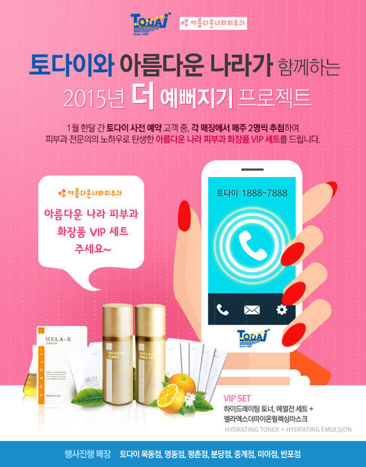 '2015년 더 예뻐지기 프로젝트'는 1월 한 달간 사전 예약을 하는 이용자 중 추첨을 통해 매주 2명에게 아름다운 나라 피부과에서 만든 화장품 VIP세트를 증정하는 이벤트이다.