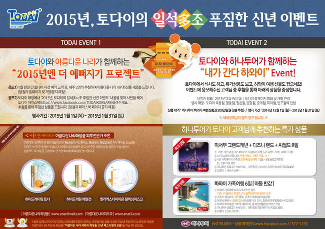 더불어 하나투어와 함께하는 하와이 여행상품 이벤트로 1월 31일까지 토다이 직영점에서 진행되며, 토다이에 방문해 응모권을 작성하면 추첨을 통해 하나투어 하와이 여행 200만 원 상품권을 증정하는 이벤트이다.
