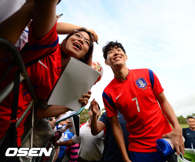 5일 오후 호주 시드니 매쿼리대학교 스포츠필드에서 열린 공개 훈련에서 손흥민이 팬과 포토타임을 갖고 있다.