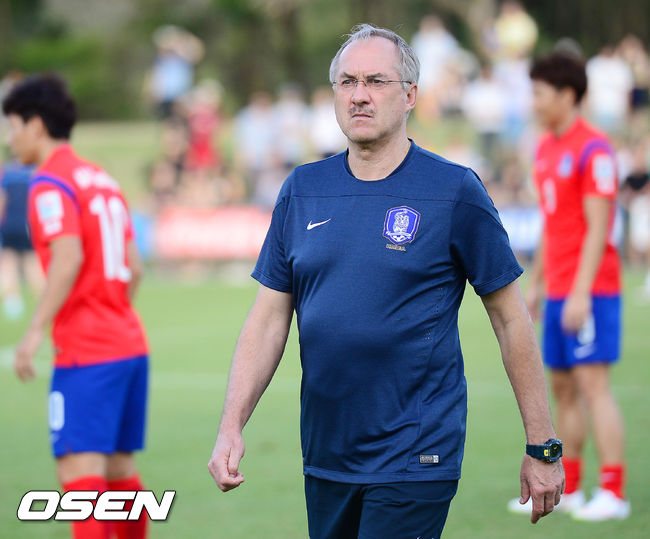 5일 오후 호주 시드니 매쿼리대학교 스포츠필드에서 열린 공개 훈련에서 슈틸리케 감독이 선수들의 훈련을 바라보고 있다.