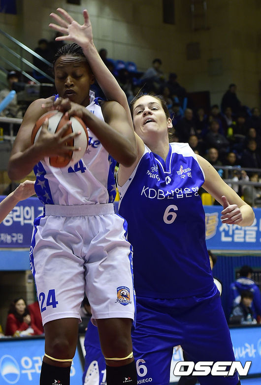5일 오후 경기도 구리시체육관에서 열린 'KB국민은행 2014-2015 여자프로농구' KDB 생명과 우리은행의 경기, 1쿼터 우리은행 휴스턴이 KDB 테일러를 피해 리바운드에 성공하고 있다.