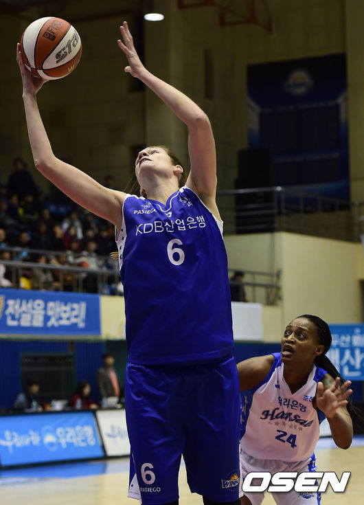 5일 오후 경기도 구리시체육관에서 열린 'KB국민은행 2014-2015 여자프로농구' KDB 생명과 우리은행의 경기, KDB생명 테일러가 휴스턴을 피해 슛을 시도하고 있다.